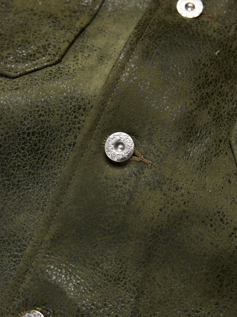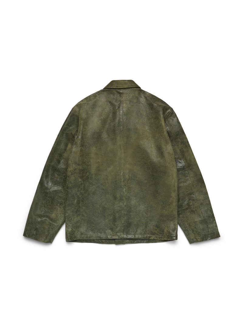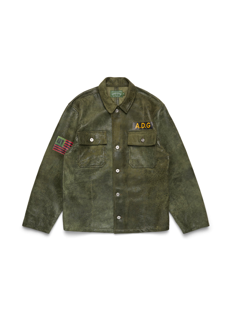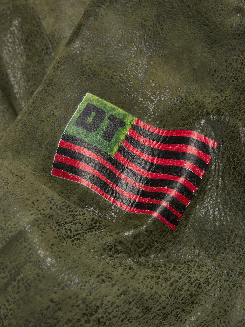 Produced in Vintage Green distressed cow leather and cut to a regular fit, our Leather Jungle Shirt features screenprinted African Diaspora Goods and DT Pan-African American flag patches on the chest and arm.